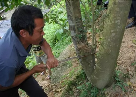 用砍傷法讓沉香樹快速結(jié)香的方法,是最常用的一種人工造香方法??硞ㄐ枰x擇6-8年以上胸徑10厘米以上的沉香樹,然后,在距離地面1.5米的地方,順砍數(shù)刀,刀與刀之間的距離約30-40厘米左右,傷口深約3-4厘米左右。