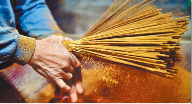 神香屬手工制作行業(yè),可分搓香、淋香和榨香三種制法。昔日澳門的制香廠多集中在沙梨頭及田畔街一帶的空曠土地上,以方便曬香。澳門神香制成品種類多樣,有長(zhǎng)短、粗細(xì)、形狀、顏色之分,價(jià)格也會(huì)因應(yīng)香料質(zhì)量?jī)?yōu)劣高低而有所不同。